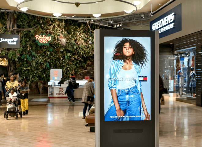 Advertisements placed inside shopping malls, including digital screens, banners, kiosks, and floor decals, to engage shoppers while they browse, dine, and socialize.